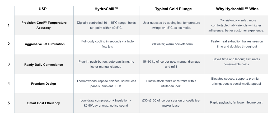 Discover why HydroChill™ outperforms every other cold-plunge system on the market. Engineered for precision, power and ease, our four core innovations deliver a safer, more effective and utterly hassle-free recovery experience.